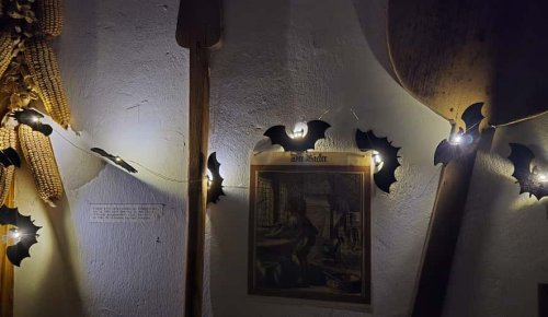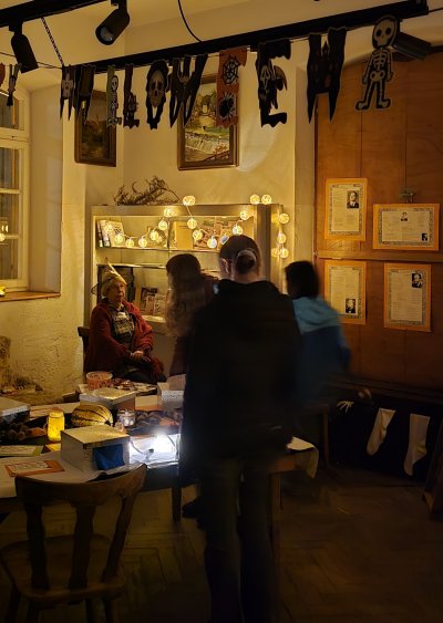 Im Inneren warteten skelettierte Gestalten, die beim Vorbeigehen gruselige Geräusche von sich gaben. Doch statt panischer Schreie ertönten fröhliche Lacher – zu offensichtlich waren die knochigen Gesellen mehr Spaßvögel als Schreckgespenster. Manche Kinder kamen gar nicht davon los, und so wurden die lauten Skelette im Laufe des Abends zudem zu beliebten Fotomotiven. Alle halbe Stunde führten Hans, Steffen und Werner zahlreiche Gäste durch die dunklen Räume des Museums. Da die Halloween-Beleuchtung zwar für Stimmung, aber nicht unbedingt für Helligkeit sorgte, halfen Taschenlampen – und natürlich die allgegenwärtigen Handys – beim Erkunden der historischen Zimmer.